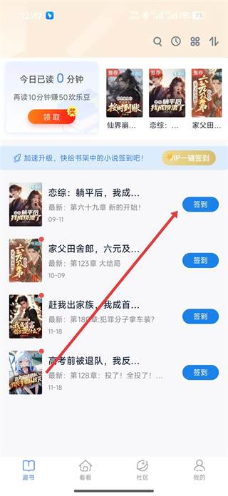 1、打開酷匠閱讀軟件,進入看書頁面,查看今日閱讀時長及推薦小說,點擊對應小說的簽到按鈕,完成該小說的簽到操作。