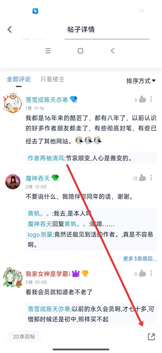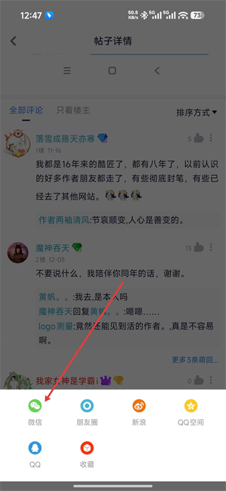 3、在帖子詳情頁查看其他用戶的評論互動內容,點擊分享按鈕,彈出分享選項準備分享該帖子。
