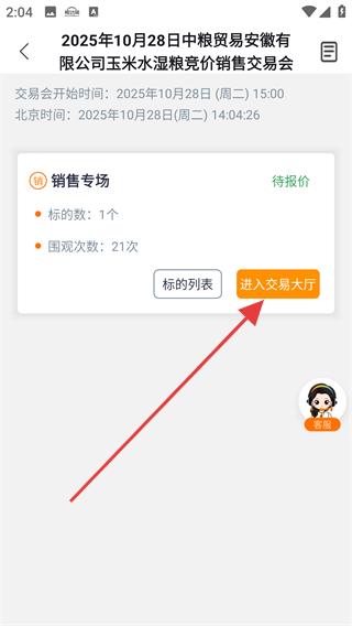 4、進入交易專場詳情頁點擊進入交易大廳,參與糧貿競價交易,了解標的數、圍觀次數等信息,完成糧貿交易操作。