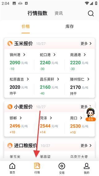 2、切換到行情頁面,查看玉米、小麥、進口糧等報價,了解錦州港、蛇口港等港口的糧價及庫存變化,掌握糧貿行情動態。