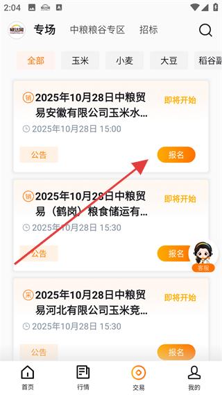 3、進入交易頁面查看中糧貿易的專場交易,如玉米水濕糧競價銷售交易會等,點擊報名,參與糧貿交易活動。