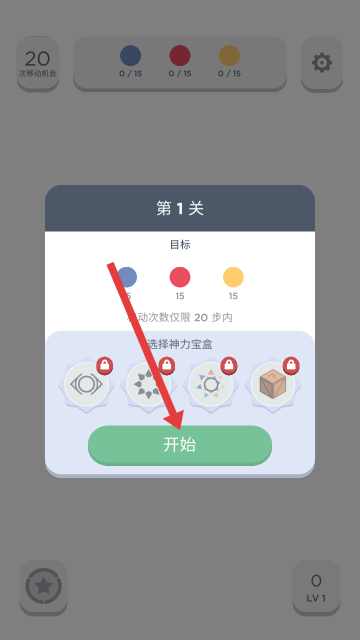 1、進入第1關,界面顯示目標及移動次數限制,點擊開始按鈕,即可開啟收集不同顏色圓點的關卡挑戰。