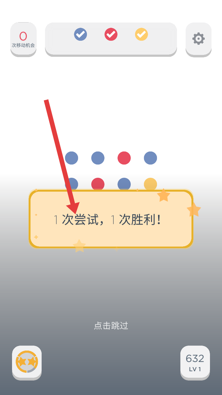 3、成功收集完目標數量的圓點后,會彈出顯示1次嘗試1次勝利的提示,宣告關卡勝利,可繼續后續流程。