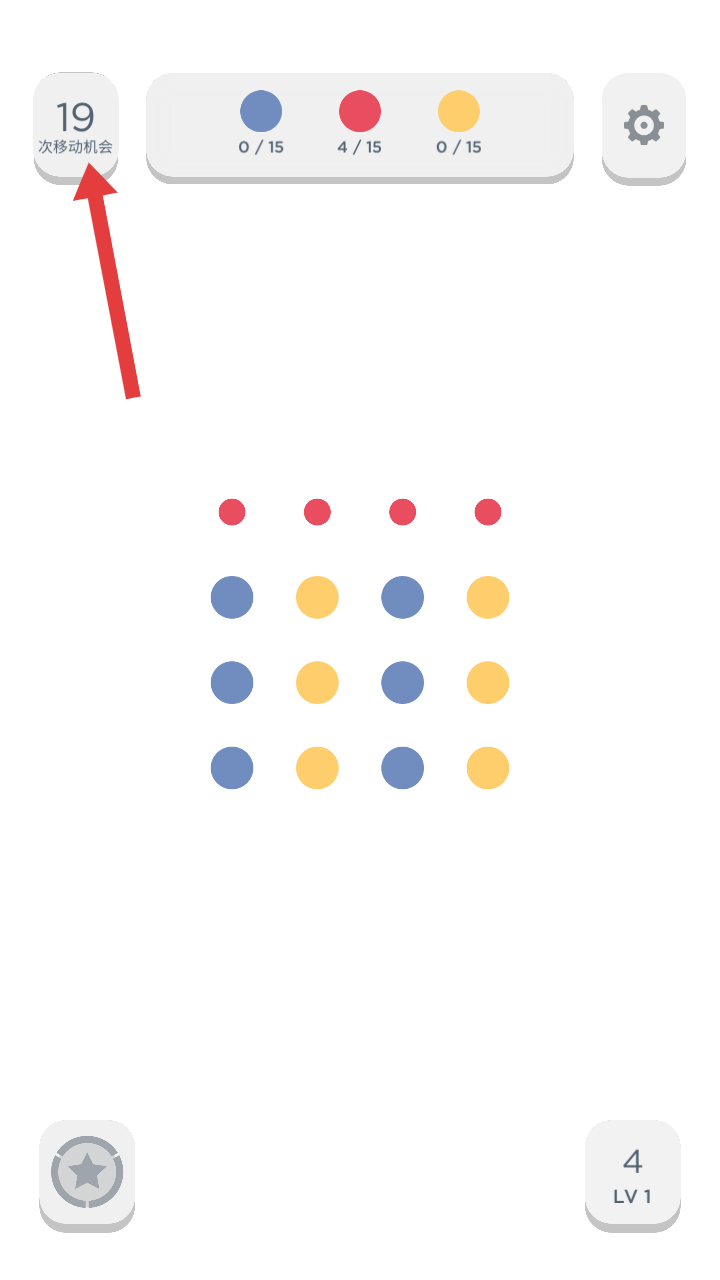 2、關卡內上方有移動次數提示,根據界面中圓點分布,合理規劃每次移動,逐步收集對應顏色的圓點。