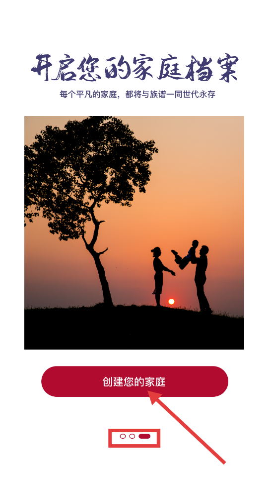 2、進入族譜網的引導界面,以開啟您的家庭檔案為主題,傳遞每個平凡家庭與族譜世代永存理念,下方設創建您的家庭按鈕,點擊可開啟家族檔案創建流程。