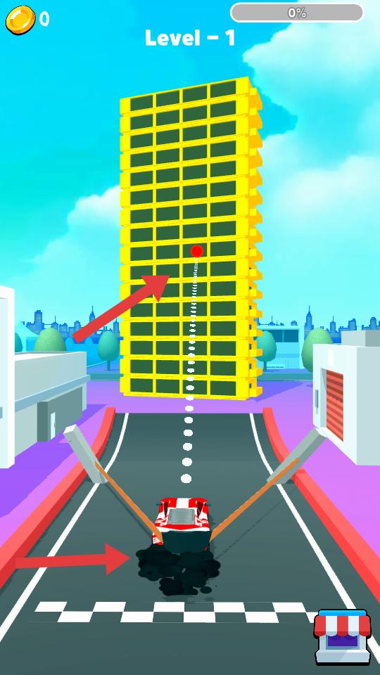 1、游戲開始,操控車輛,利用車上裝置,瞄準建筑,發起沖擊,開始粉碎建筑,推進游戲進程。