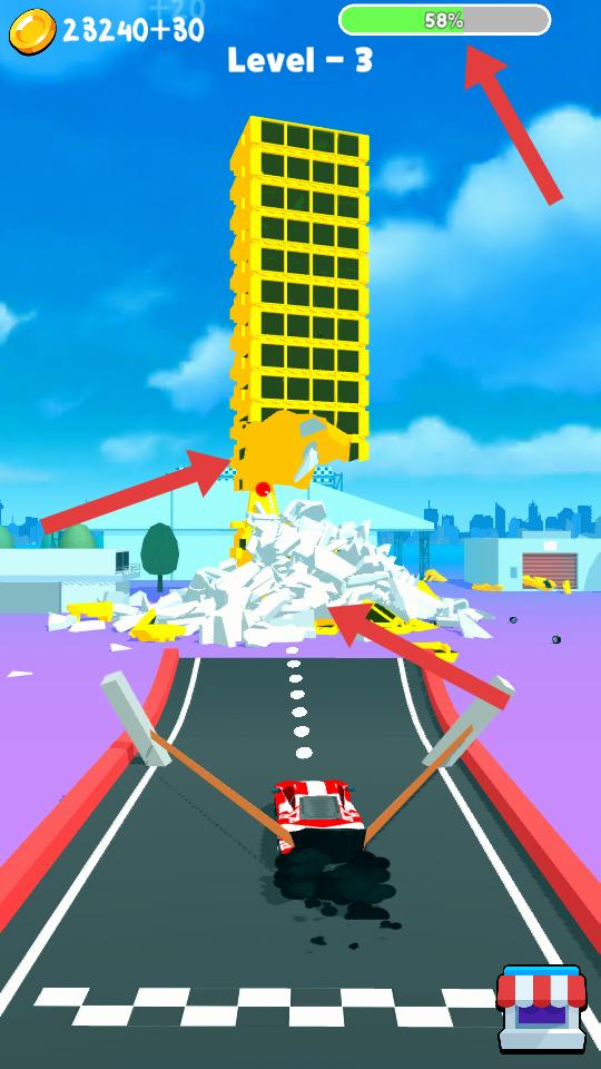 2、粉碎建筑時,觀察上方進度條,持續操作讓建筑不斷倒塌,產生大量碎片,直到進度條推進到一定程度。