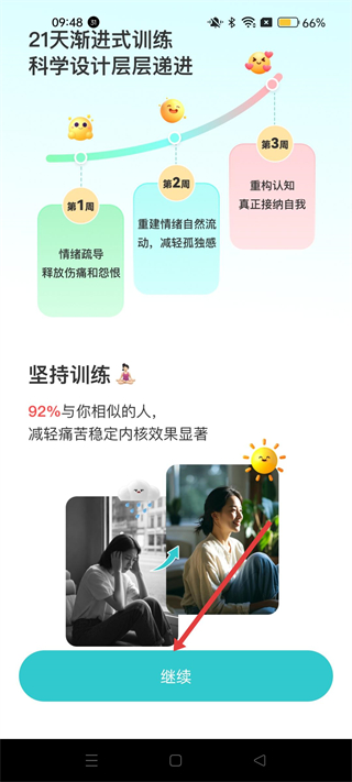 2、21天漸進式訓練界面,能了解到每周的訓練目標,第一周情緒疏導,第二周重建情緒自然流動,第三周重構認知,堅持訓練可減輕痛苦穩定內核,點擊繼續可進行訓練。