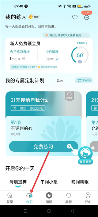 1、進入練習界面,可查看我的練習相關內容,有新人免費領會員活動,還能看到今日練習目標和活躍情況,以及專屬定制計劃。