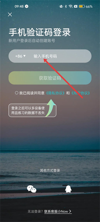 3、登錄界面支持手機驗證碼登錄,輸入手機號碼,獲取驗證碼,勾選隱私協議和用戶協議即可登錄,新用戶登錄后自動創建賬號,也可選擇其他方式登錄。