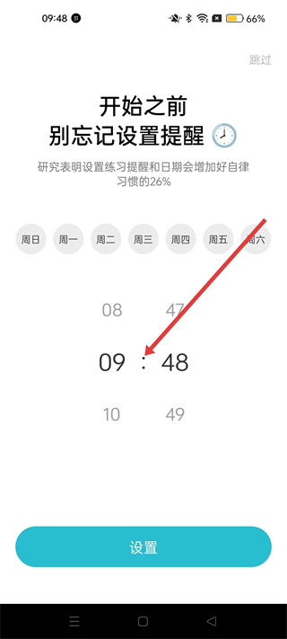 4、設置提醒界面,可選擇每周的提醒日期,設置具體的提醒時間,研究表明設置練習提醒能增加自律習慣,設置完成后可開啟練習提醒。