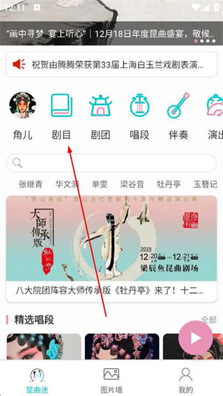 1、打開昆曲戲曲資訊軟件,進入昆曲迷頁面,點擊劇目選項,進入經典劇目列表頁面,查看各類昆曲劇目內容。