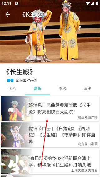 3、在長生殿詳情頁面點擊賞析板塊下的相關資訊,進入資訊詳情頁面,了解該劇目演出的具體信息。