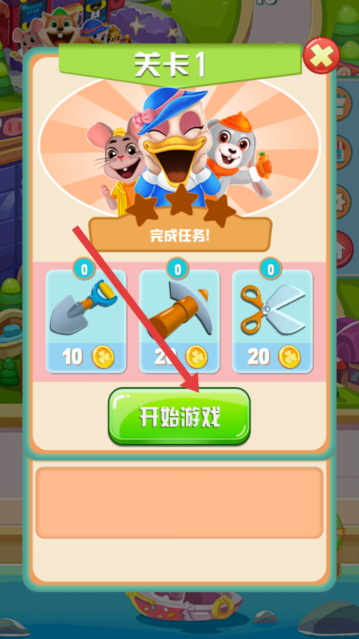 2、關卡1界面,能看到完成任務的提示和相關道具,點擊開始游戲按鈕,正式進入關卡。