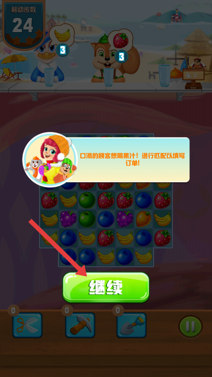 3、進入關卡后,會彈出口渴的顧客想喝果汁的提示,點擊繼續按鈕,開始為顧客匹配果汁所需水果。