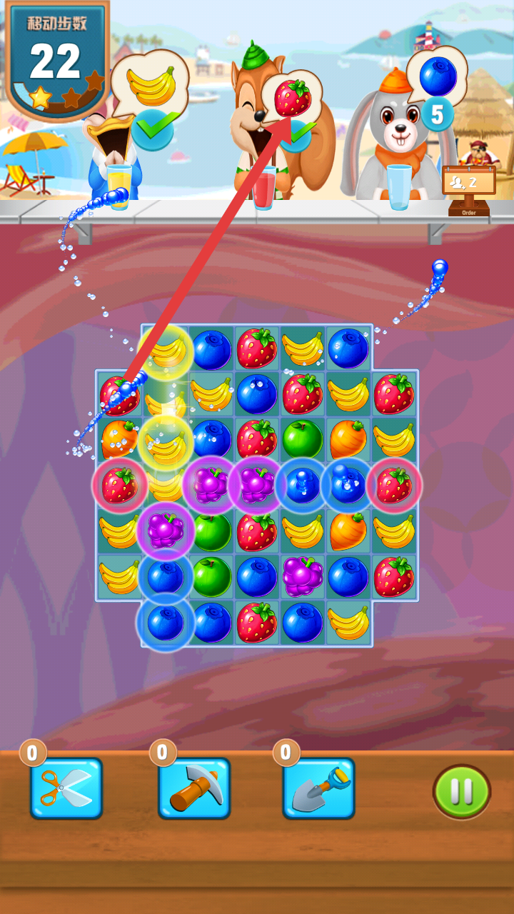 4、通過移動水果方塊,讓相同水果連成線消除,收集顧客需要的水果,為其制作果汁,完成訂單任務。