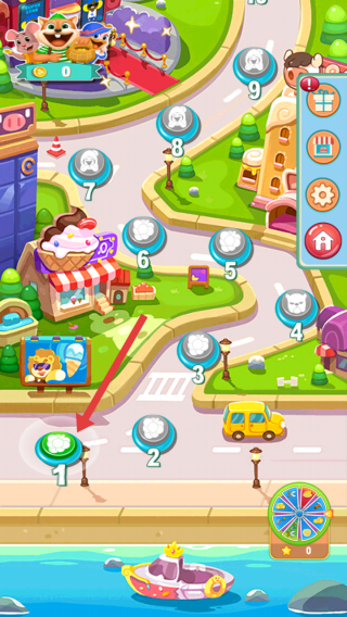 1、進入游戲,關卡地圖中點擊標有數字1的按鈕,進入關卡1的準備界面等待開始消除水果。