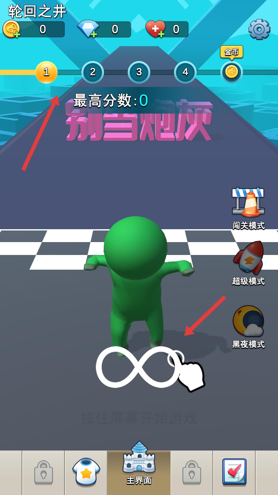1、游戲初始界面,按住屏幕上的無限符號,開始游戲,操控綠色角色在道路上前進,同時可留意右側的闖關、超級、黑夜等模式,選擇適合的模式游玩。