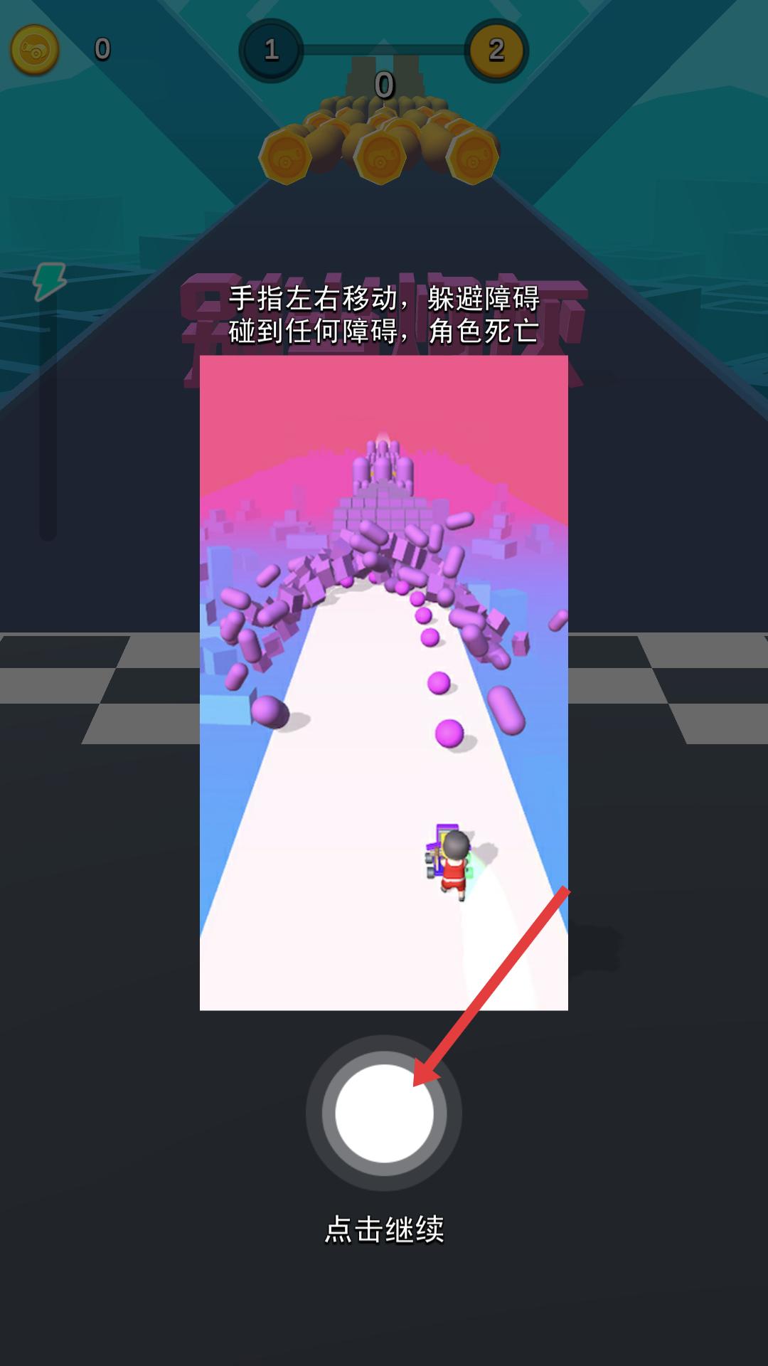 2、游戲開始前,會有操作提示,手指左右移動可躲避障礙,碰到障礙角色會死亡,點擊下方點擊繼續按鈕,進入正式游戲場景。