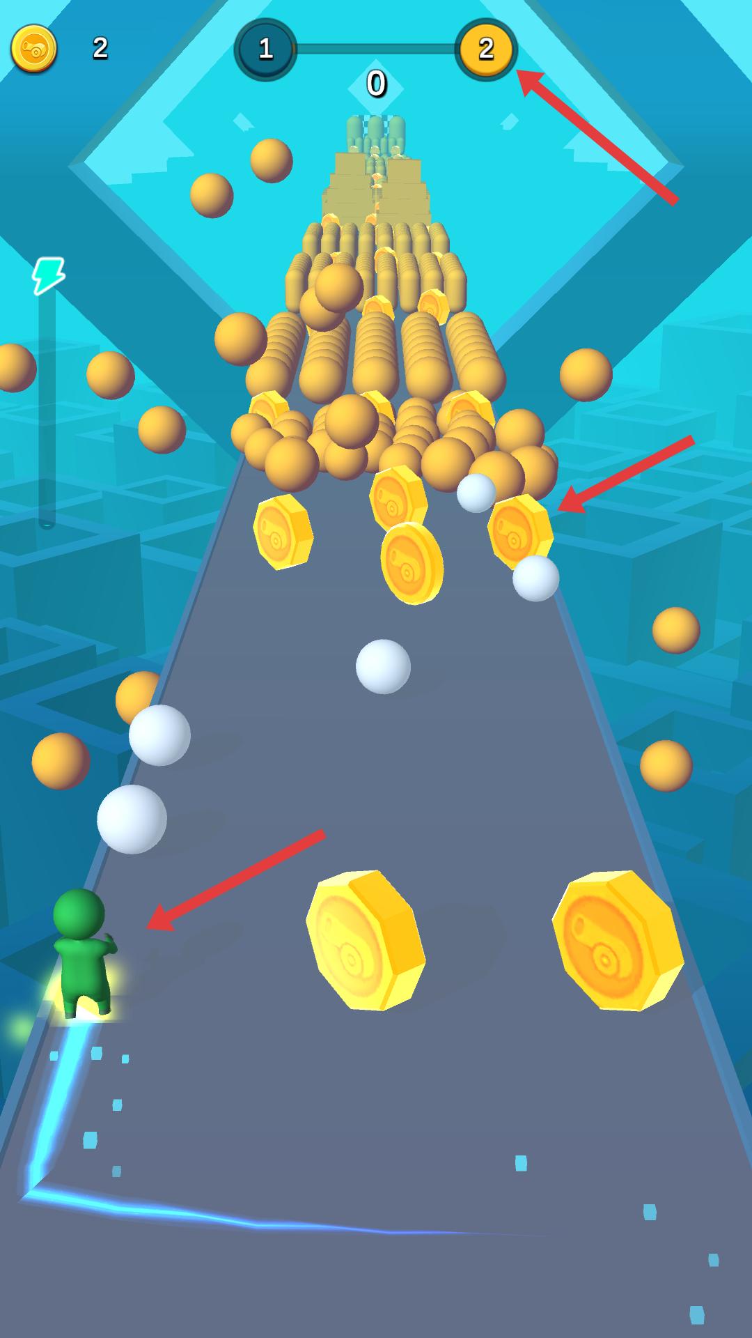 3、進入游戲后,手指左右滑動操控綠色角色,躲避白色的球體障礙,同時盡可能收集路上的金幣,朝著上方的目標數字前進,積累分數。