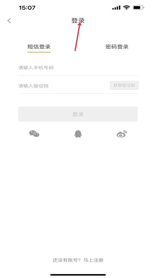 1、進入應用先進入登錄界面支持短信或密碼登錄也可通過第三方賬號登錄若未注冊可點擊馬上注冊完成賬號驗證后即可進入應用。