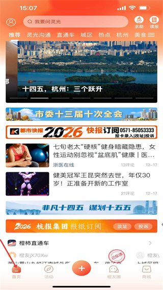 2、登錄后進入首頁頂部設搜索欄及求助讀報功能設有推薦靈光溝通等頻道展示各類資訊內容底部配備首頁活動等功能導航欄。