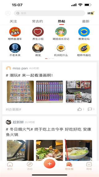 4、進入橙友圈頁面包含不同興趣板塊展示用戶發布的內容附帶話題標簽可對內容執行點贊評論操作參與社區內的互動交流。