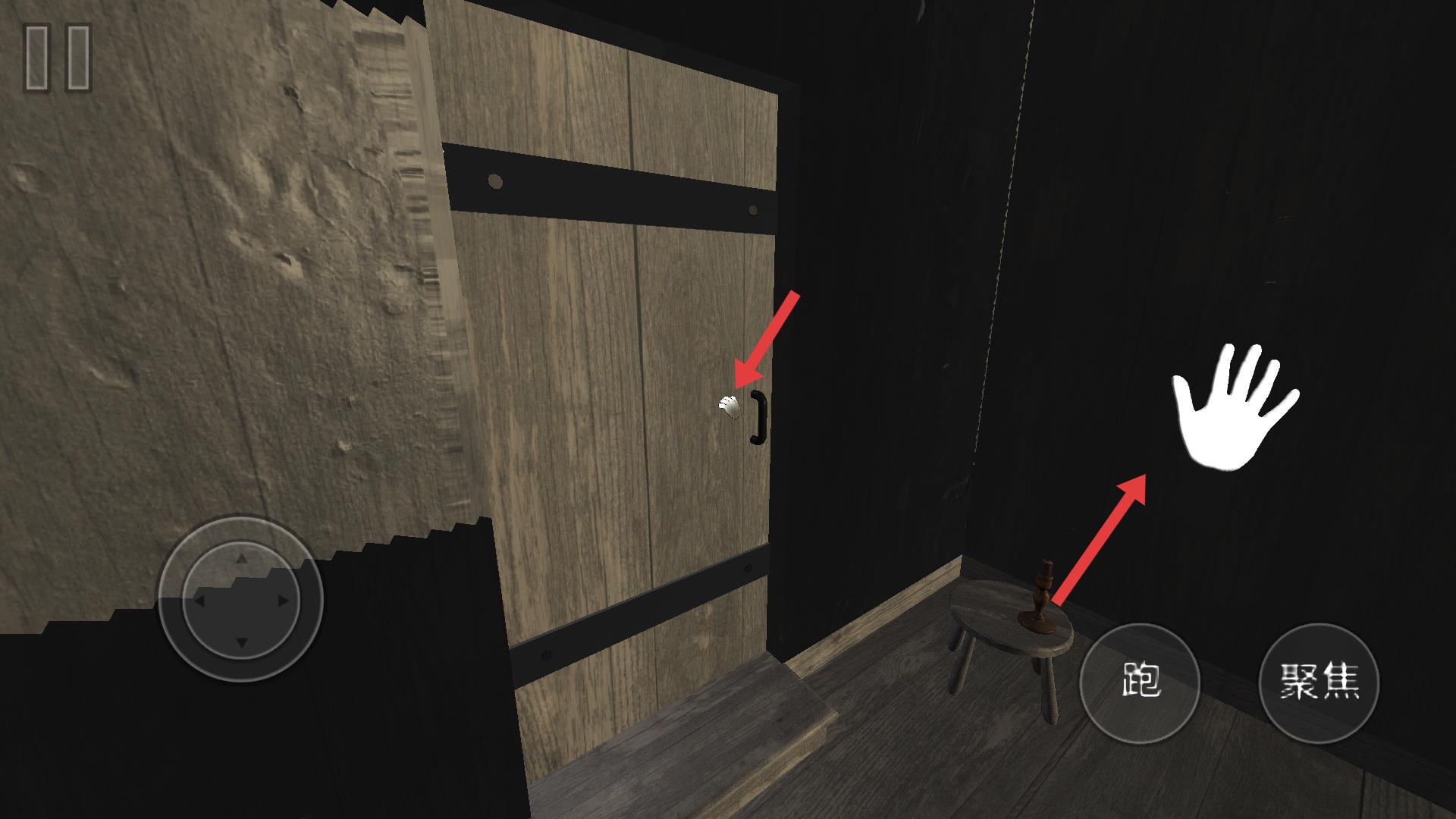 3、靠近木門,點擊把手圖標開門,結合搖桿移動穿過,利用跑快速通過,聚焦查看細節,探索新區域,尋找任務線索。