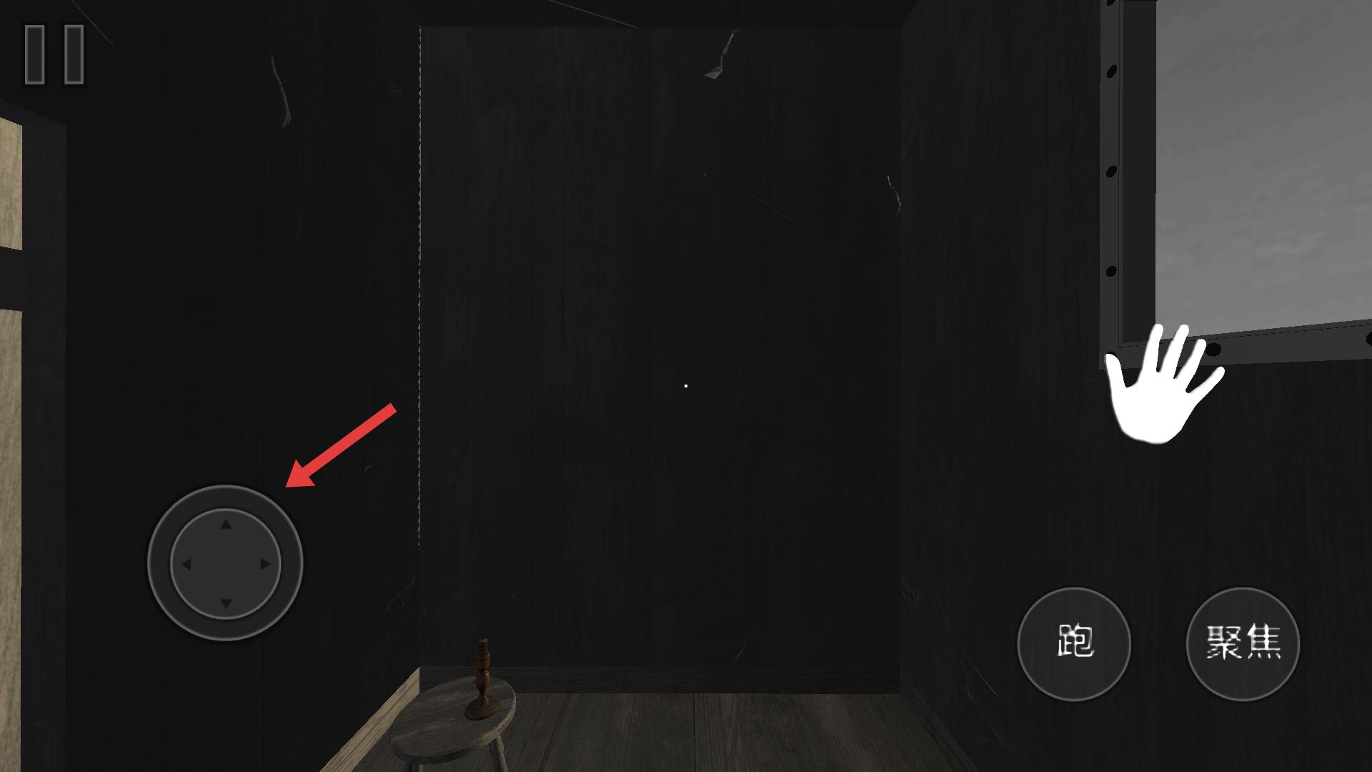 2、在黑暗房間,用左側搖桿控制移動,右側跑、聚焦輔助,按箭頭指引探索,留意互動點,嘗試開門、搜尋道具,推進場景進度。