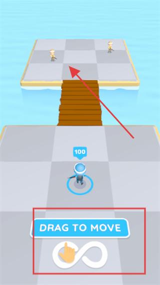 1、進入游戲看到藍色水域環繞的海島場景,按照提示,通過拖拽操作控制角色移動,朝著有木橋連接的前方平臺行進。