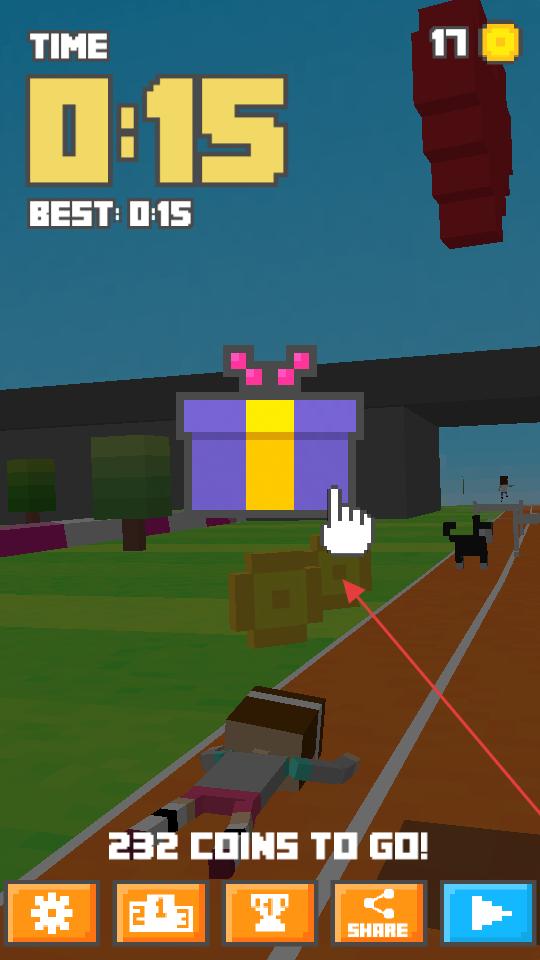 4、若角色在奔跑中摔倒界面會顯示時間和金幣等信息,此時點擊出現的禮盒,可獲取獎勵,之后繼續操控角色在跑道上奔跑,挑戰更好的成績。