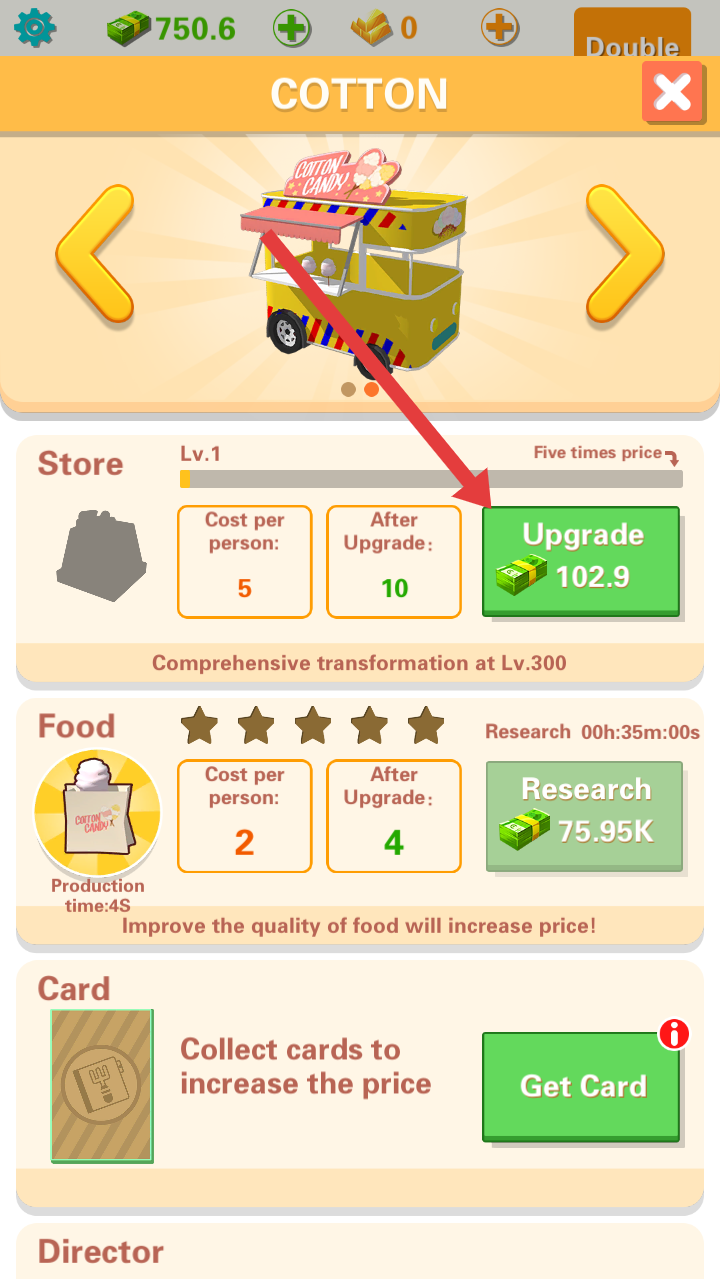 2、冰淇淋攤位升級界面花費資金進行升級,升級后單人成本等會發生變化,有助于提升攤位收益。