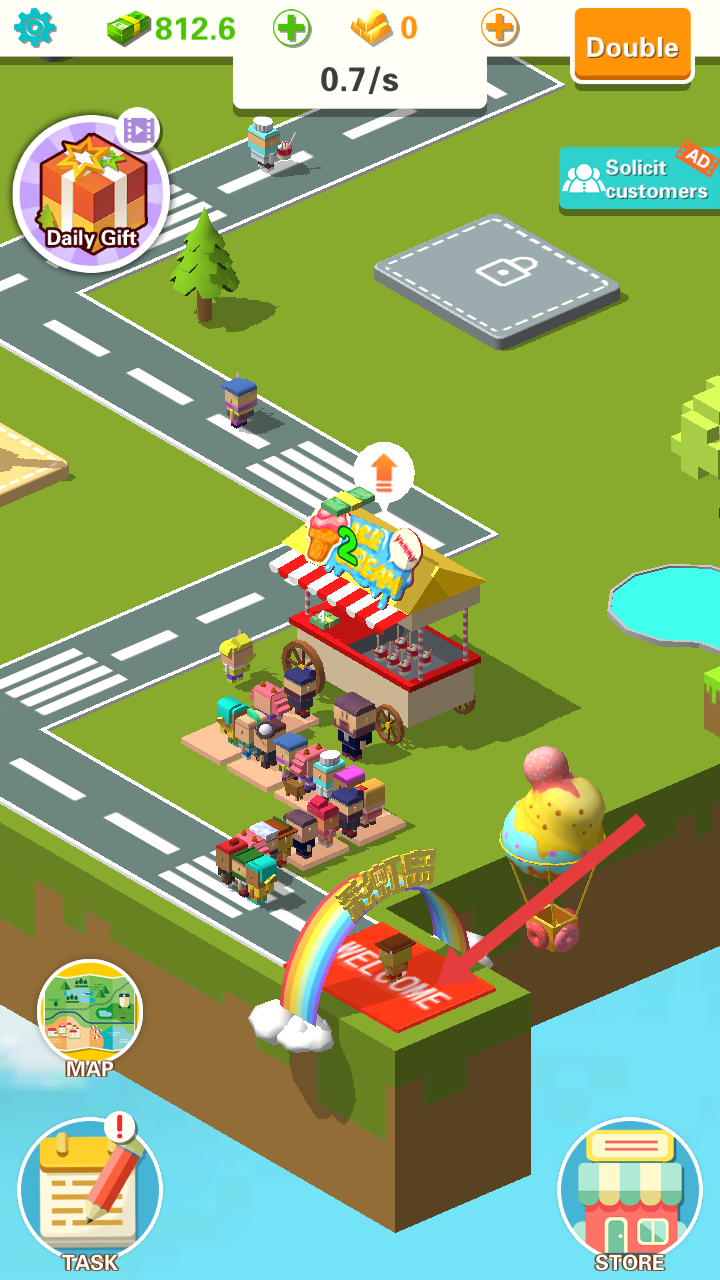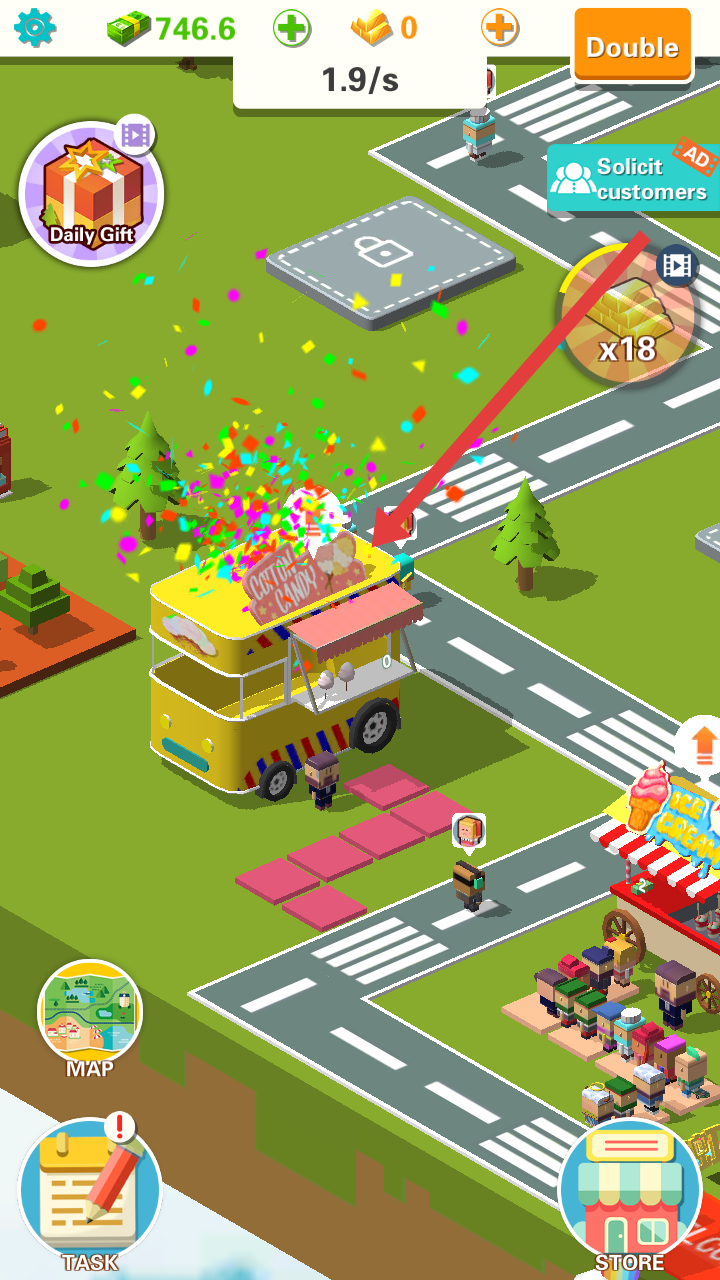 1、美食經營場景中有冰淇淋攤位和棉花糖攤位等,點擊門口的紅色地毯可以為工廠帶來客人。