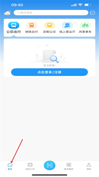 1、首頁,有公交、地鐵等出行服務入口,未登錄顯示暫無數據,需點擊登錄注冊查看個人信息。