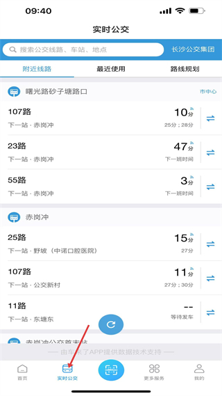 2、實時公交界面可搜線路車站,展示附近線路實時信息,如107路、23路等的到站時間和下一站,還可查最近使用和路線規劃。