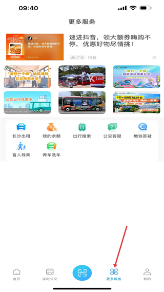 3、更多服務界面有活動廣告,還有長沙出租、出行搜索、公交地鐵答疑等多種服務,滿足用戶出行相關的多樣需求。