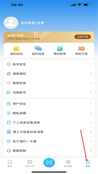 4、我的界面可登錄注冊,登錄后有錢包、消息等功能,還有賬號管理、協議政策查詢及湘行一卡通介紹和客服幫助。