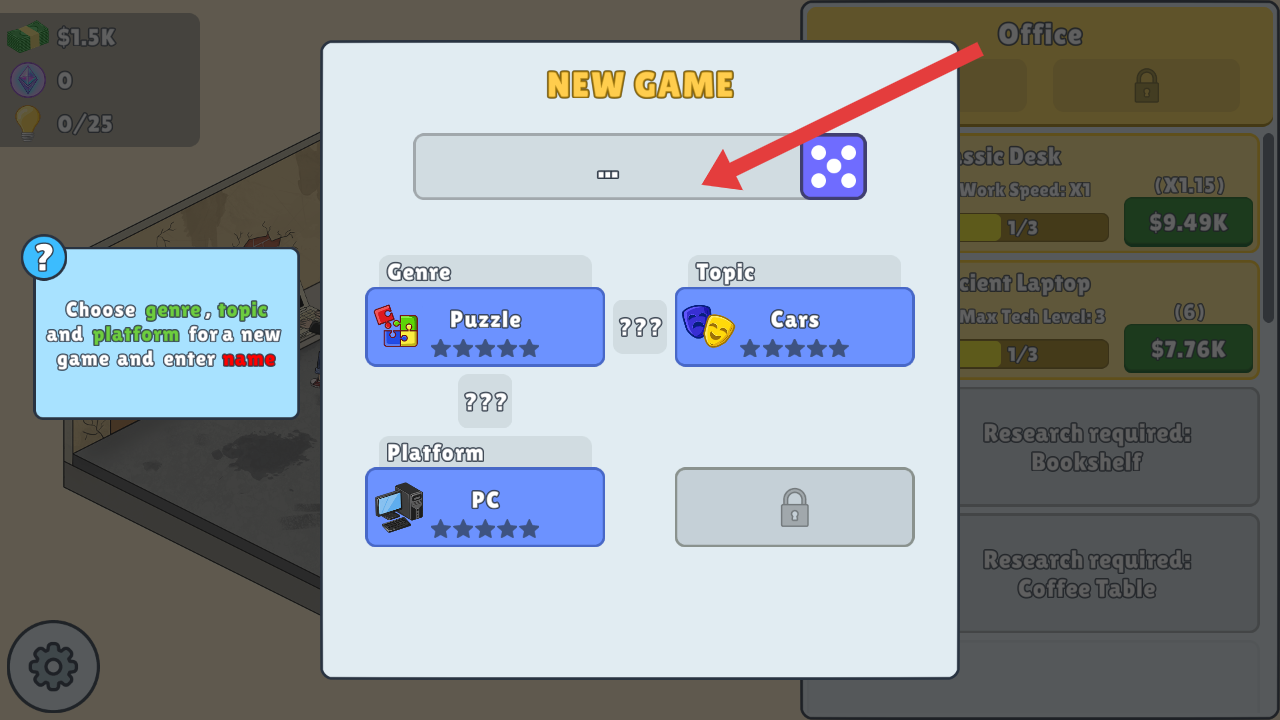 2、開啟新游戲時,會彈出界面,可輸入游戲名稱,還能選擇游戲類型、主題以及發布平臺,打造專屬游戲。