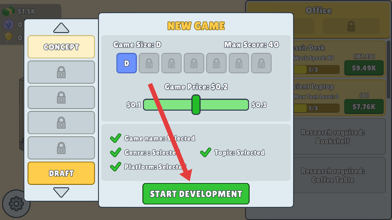 3、新游戲設置界面,確定好游戲規模、價格等后,點擊STARTDEVELOPMENT按鈕,即可開始游戲開發。