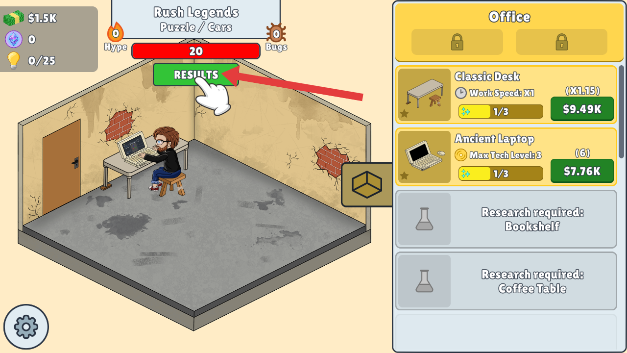 4、游戲開發完成后,界面會顯示游戲相關熱度等數據,點擊RESULTS按鈕,可查看游戲最終成果與收益情況。