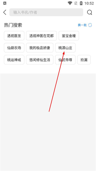 1、打開蜜桃小說APP,進入搜索頁面,在熱門搜索區域找到桃源山莊選項,點擊該選項,觸發相關書籍的搜索結果展示。