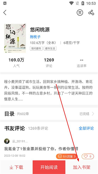 2、在搜索結果列表中選擇悠閑桃源這一書籍,點擊進入該書的詳情頁面,查看書籍的字數人氣評論數等信息。
