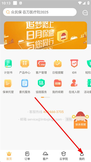1、進入首頁可使用計劃書產品中心等功能,包含保險業務相關的各類工具,底部導航欄可切換至不同板塊,還能通過客服熱線或聯系客服獲取支持。