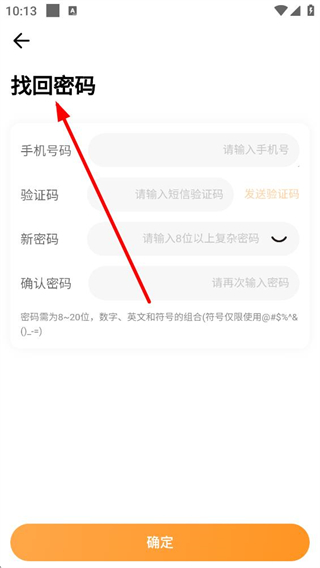 3、找回密碼需填寫手機號,獲取并輸入短信驗證碼,設置包含數字、英文和指定符號的復雜密碼,確認后點擊確定完成重置。