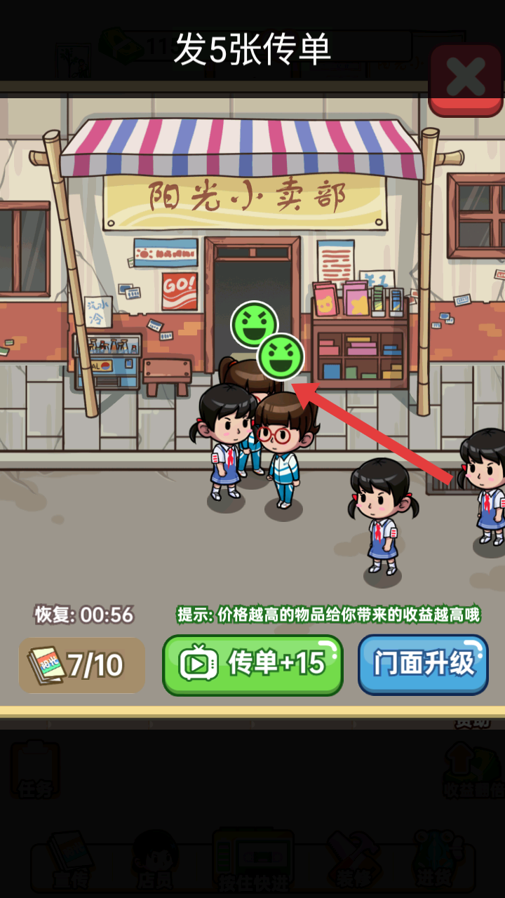1、游戲里可通過發傳單如發5張傳單等宣傳方式,吸引顧客前來陽光小賣部進行選購商品。