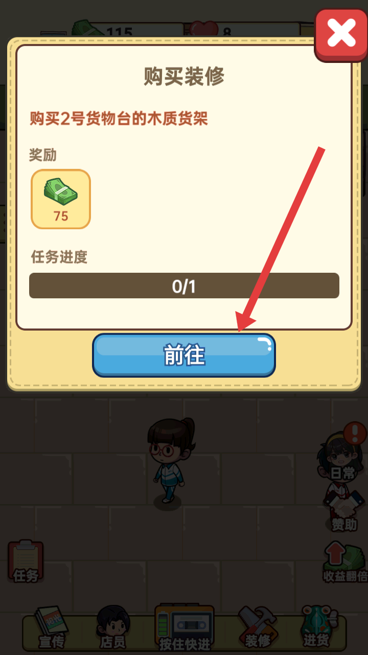 2、能進行店鋪裝修做日常任務,比如購買2號貨物臺的木質貨架,完成裝修任務可獲得金錢獎勵。