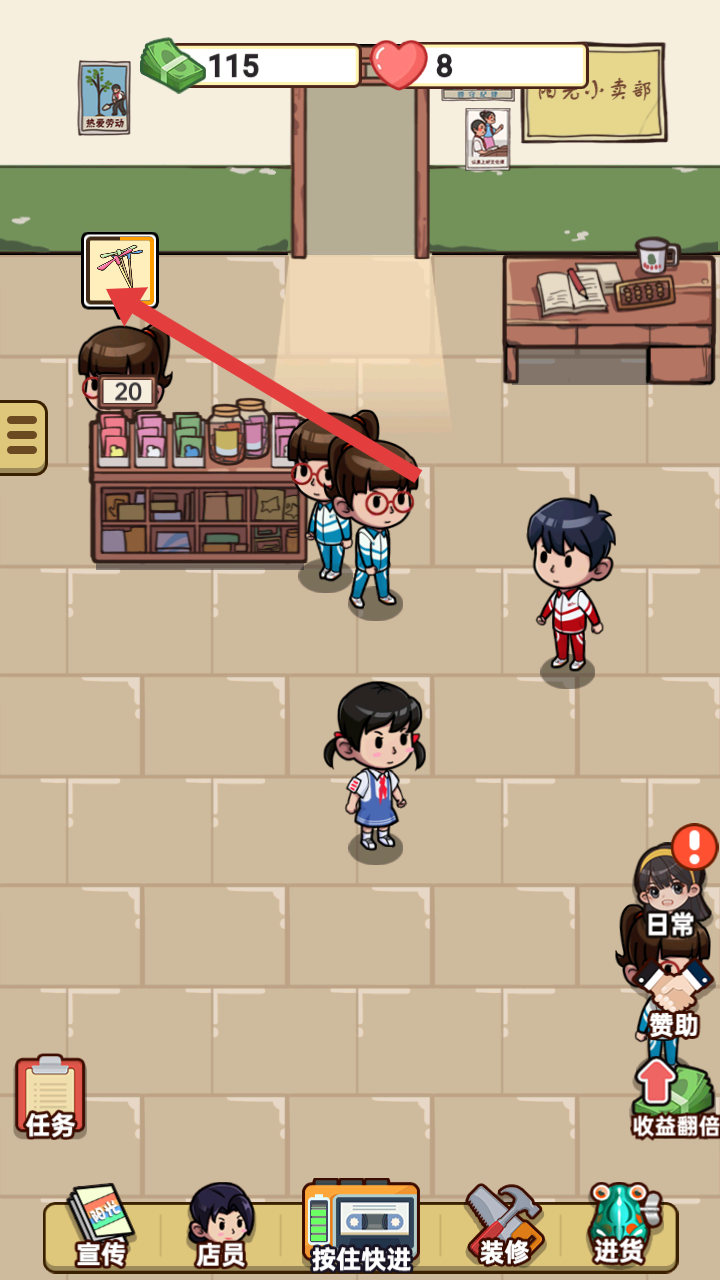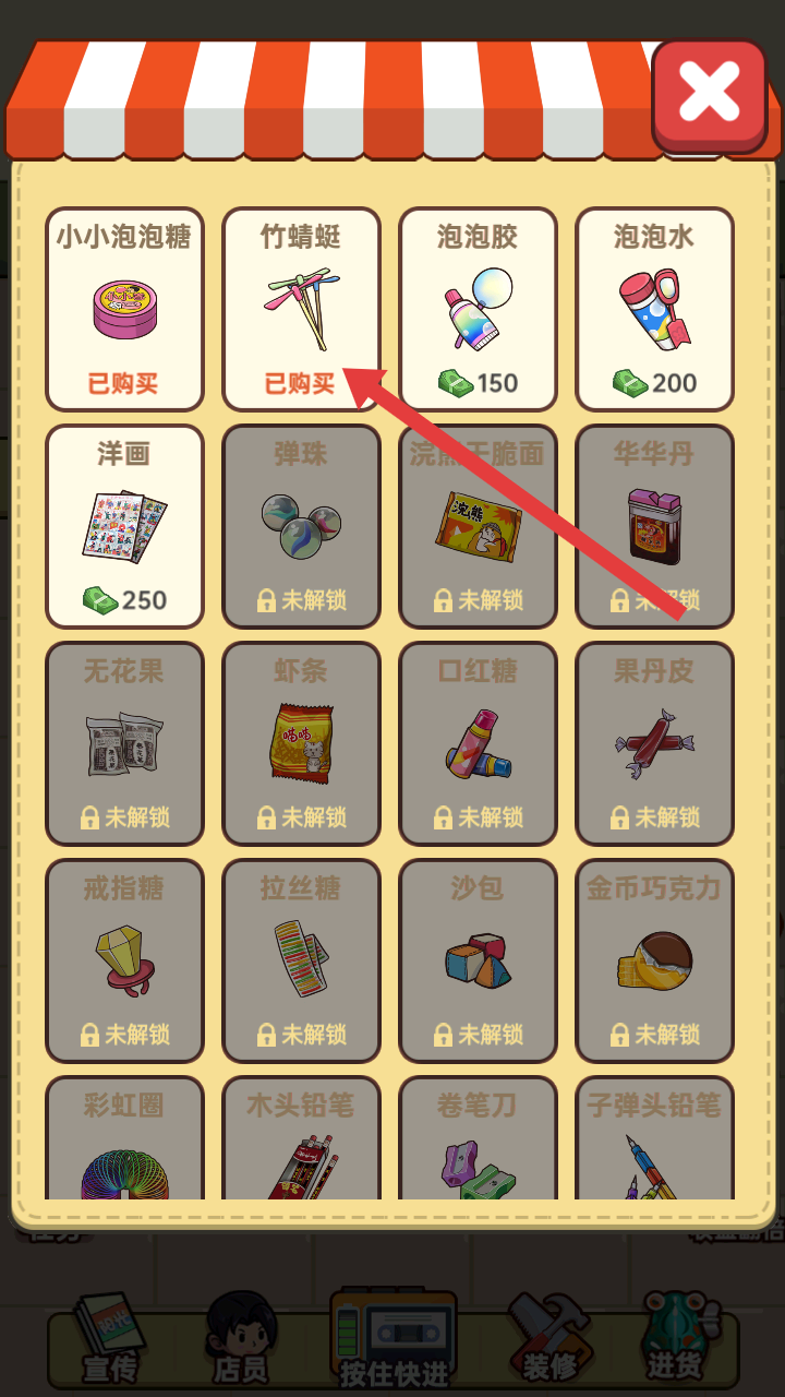 4、還可以進貨各類商品,像竹蜻蜓、小小泡泡糖等,豐富小賣部的商品種類,售賣給顧客。