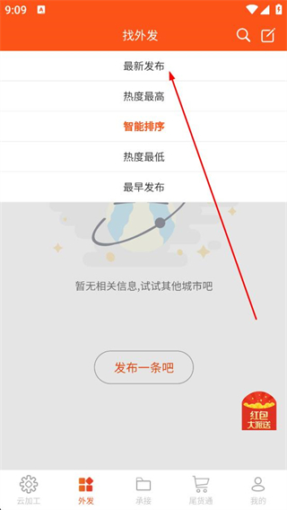 4、在找外發頁面可選擇最新發布熱度最高等排序方式,若暫無信息可嘗試切換城市,也能點擊發布一條吧按鈕發布自身需求。