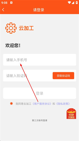 1、打開云加工app,進入登錄頁面,輸入手機號點擊獲取驗證碼,填寫驗證碼后勾選同意相關協議,點擊登錄按鈕完成賬號登錄。