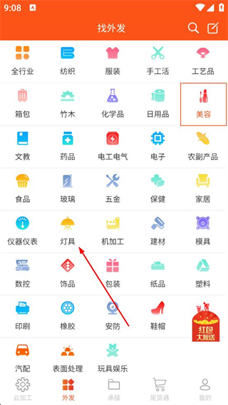 3、進入找外發頁面選擇行業分類如美容燈具等,點擊對應分類標簽,可篩選出該行業下的外發信息,便于精準查找需求。